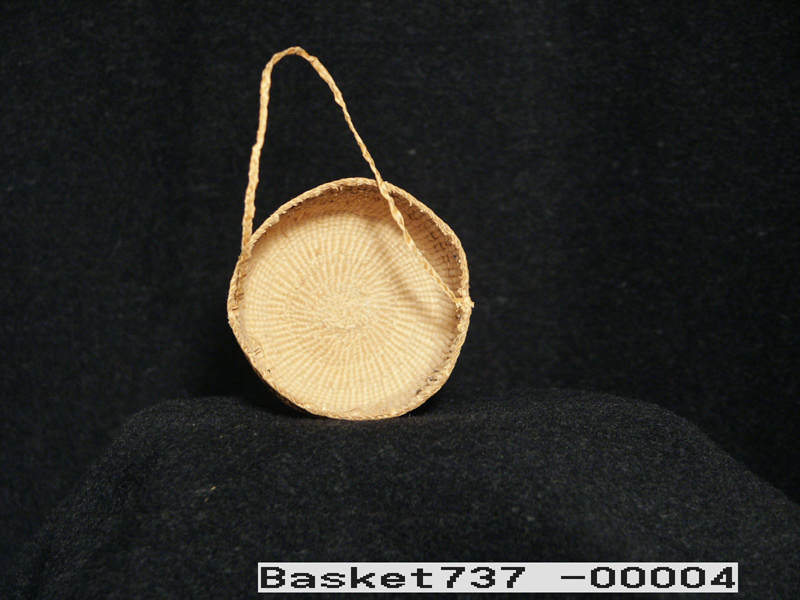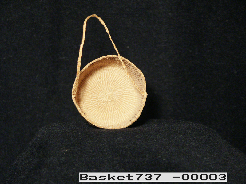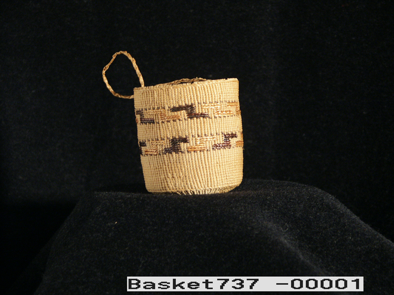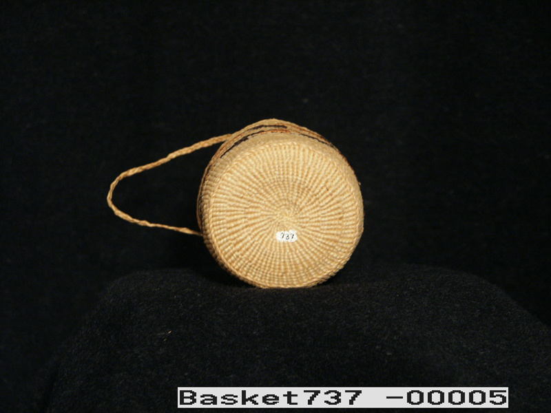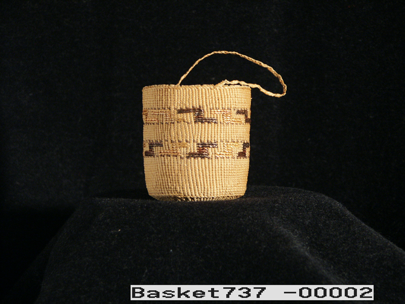 This small spruce root basket with handle was made in Sitka by Mrs. Mary (John) Sam, a Thlingit Indian woman, 1966. Purchased in March 1967 from Mrs. Sam.