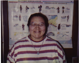 Librarian/Class Room Aide Clara is a librarian and classroom aide for grades K-7. Her boss is Roger Adams. Her employer is the Lower Yukon School District. She is getting paid $13.00 an hour and works 6 hours a day, five days a week. Clara's main responsibilities are: making sure kids learn their different subjects, keeping the library in order, giving new books a number, making sure students follow rules, and doing anything else that needs to be done in the library. She mainly works with grades K-7 except for 4th and 5th grades. The best thing about her job, she says, is to watch the kids learn new things and to really understand them. The worst thing about her job is when she has to watch the children outside during lunch break and the fights she has to break up there. Her advice to young adults is to finish high school, get a college degree, and take full advantage of all the training you go through. Bernice Tikiun ![]() | |