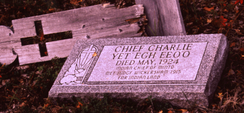 Chief Charlie was the chief of Old Minto. He was married to late Laura Charlie of Old Minto. On his head stone under his name it says "YET' EGH' EEO'O" which means "He was a strong man." It also says "INDIAN CHIEF OF MINTO MET JUDGE WICKERSHAM 1915 FOR INDIAN LAND."