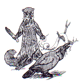 Mink came to Raven and said, "What did you do? How come you let it go when it finally came? When the sun goes down, I will do it instead." So Mink went inside the fish tail. Raven told him he would spear the grizzly when Mink jumps out. A grizzly finally came along and swallowed the fish tail. When he swallowed it, he started thrashing around. Mink cut through its chest and jumped out. While this was going on, Raven had his spear stuck between two trees. He tried to get it unstuck. Soon the grizzly fell dead from the wound that Mink had made. Mink said to Raven, "What happened? You were supposed to spear it when I came out. Why did you have the spear across your stomach so you had to lunge against it?"