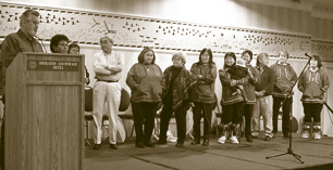 Conference participants gather on stage at the NEC banquet in Anchorage