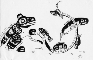 his octopus-tentacle staff to the salmon house. Here the Raven struggled
