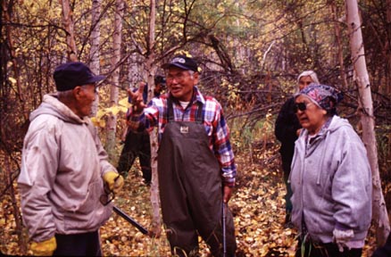 Elder Jonathan David, Robert Charlie , and Elsie Titus visiting unmarked graves on Gold stream creek
